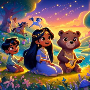 Sitara, a kind-hearted princess with sparkling eyes and a crown made of glittering stars, loved music more than anything else. She lived in a grand castle with her two favorite cousins, Duke and Blue, who were always ready for new adventures. One sunny morning, Sitara woke up to a mysterious tune fluttering through the window. "Duke, Blue!" she called, leaping out of bed. "Can you hear that?"