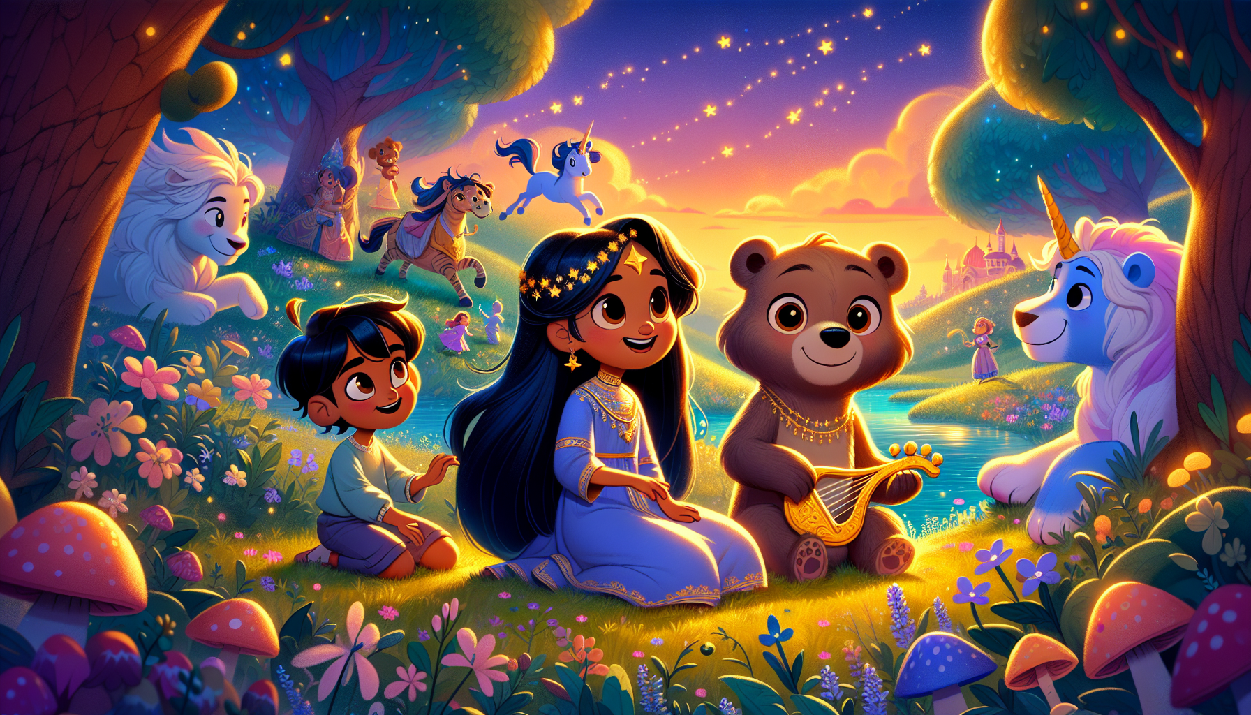 The adventure continued as they explored enchanted ponds where unicorns played tag, their manes shimmering under the sun. Sitara smiled as she watched Duke and Blue laugh with pure delight while trying to catch the unicorns.