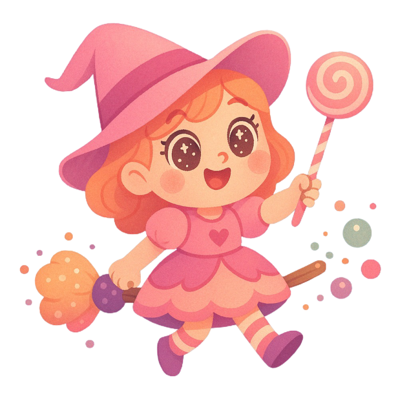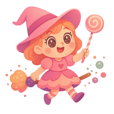 Casts candy spells with a giggle and rides a fizzy soda broomstick.