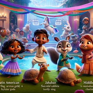 Rollo quickly rolled to share the news with his friends in the forest. First, he met Sitara the squirrel, who loved music and dancing. "Sitara, there's going to be a Grand Musical Feast at the palace!" Rollo chirped. "There'll be music, dancing, and even a flower crown contest."