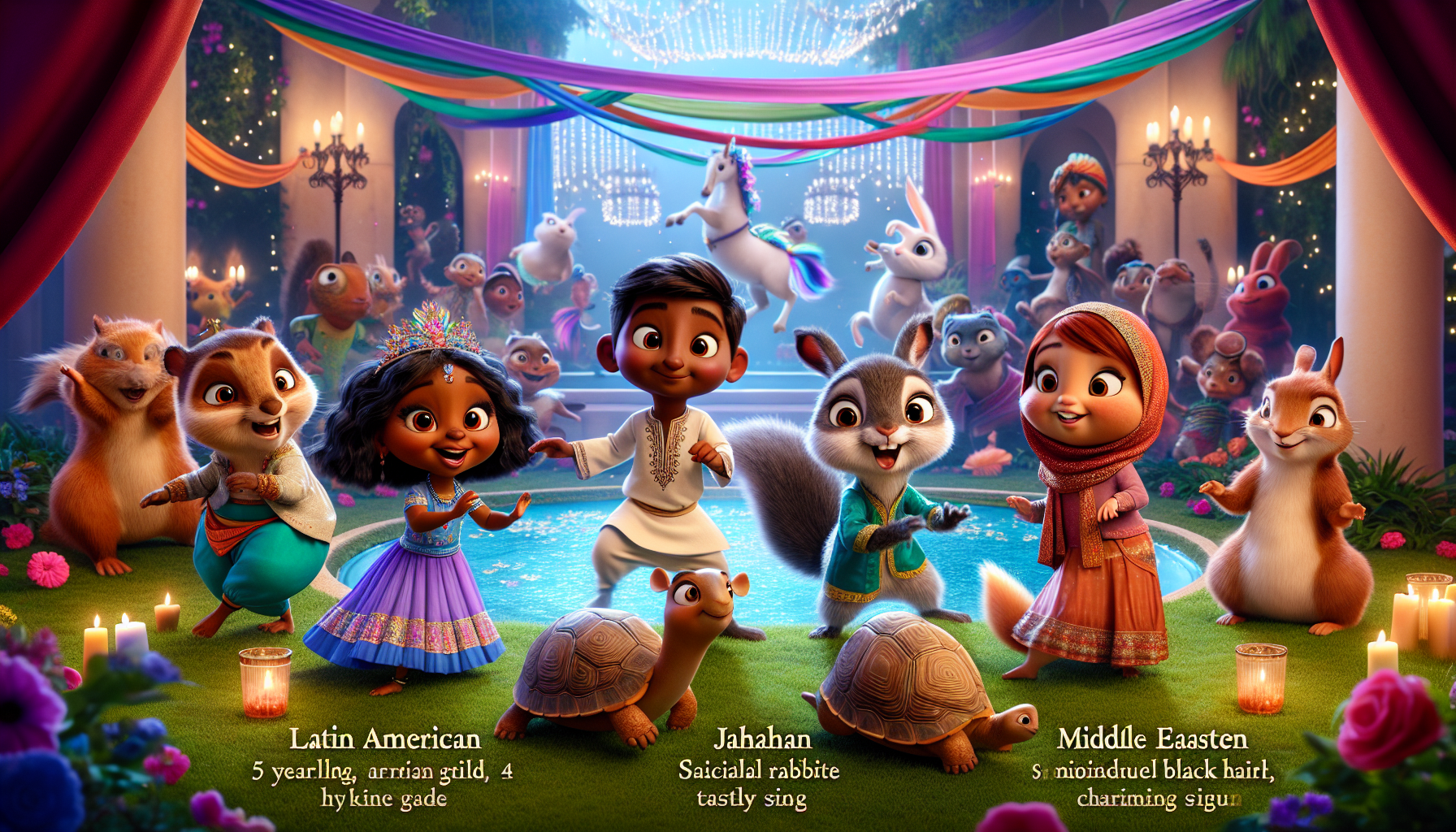When the Royal Concert began, beautiful music filled the air, and Sitara couldn't help but twirl around, her flower crown glowing under the sun's rays. Jahaan, with his clever paws, helped create a magical atmosphere with twinkling lights.