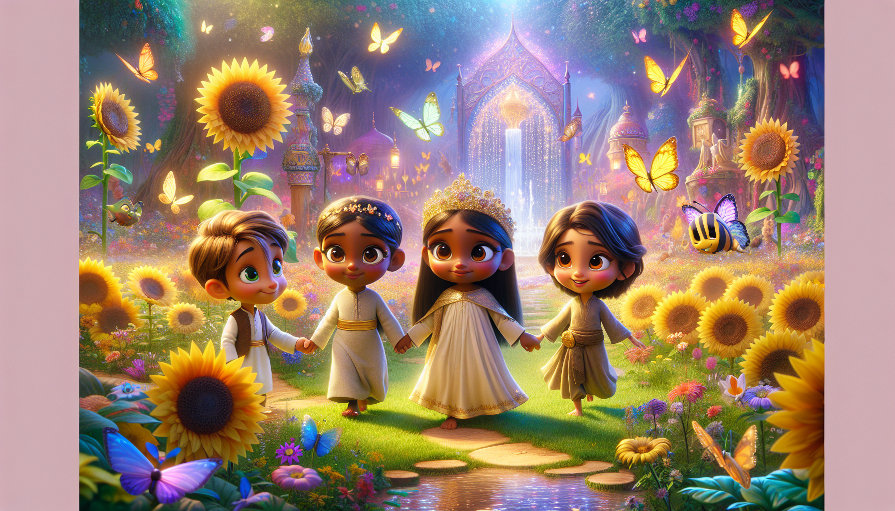 Inside the garden, the air was filled with the sweet scent of flowers, and colorful butterflies danced around them. Gigantic sunflowers stood tall like guardians, and sparkling fountains gurgled playfully.