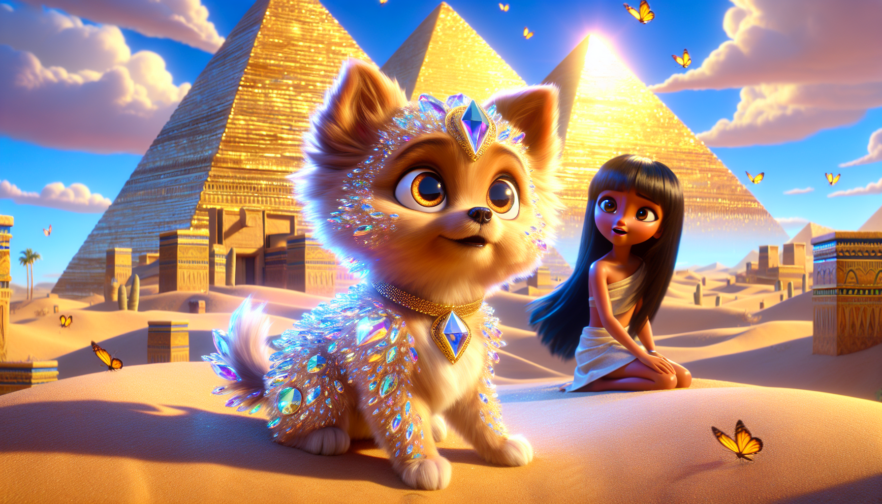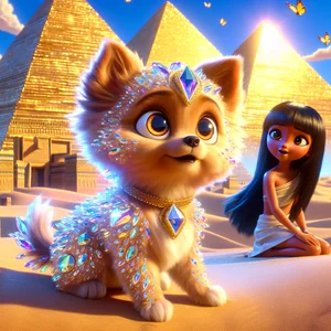 Once upon a time, in the sandy kingdom of Egypt, where the golden pyramids touched the sky, there lived a curious little puppy named Paws. Paws was not just any puppy; he had a shiny, fluffy coat that sparkled under the sun like a crown, and he loved exploring as much as Sitara loved dressing up in her princess outfits.