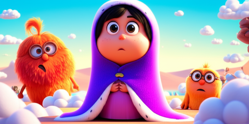 Just then, a cheerful voice called out, "Greetings, Queen! I am Angus the Adventurer, here to help!" Angus, a fluffy, orange explorer with round, curious eyes behind green goggles, bounced into the oasis. He loved exploring and was always ready for a new quest. He carried a trusty walking stick and had a leaf on his hat that was a lucky charm passed down from his grandparents. "I've heard about the fading dream clouds," he said, "and I'm excellent at finding lost things."