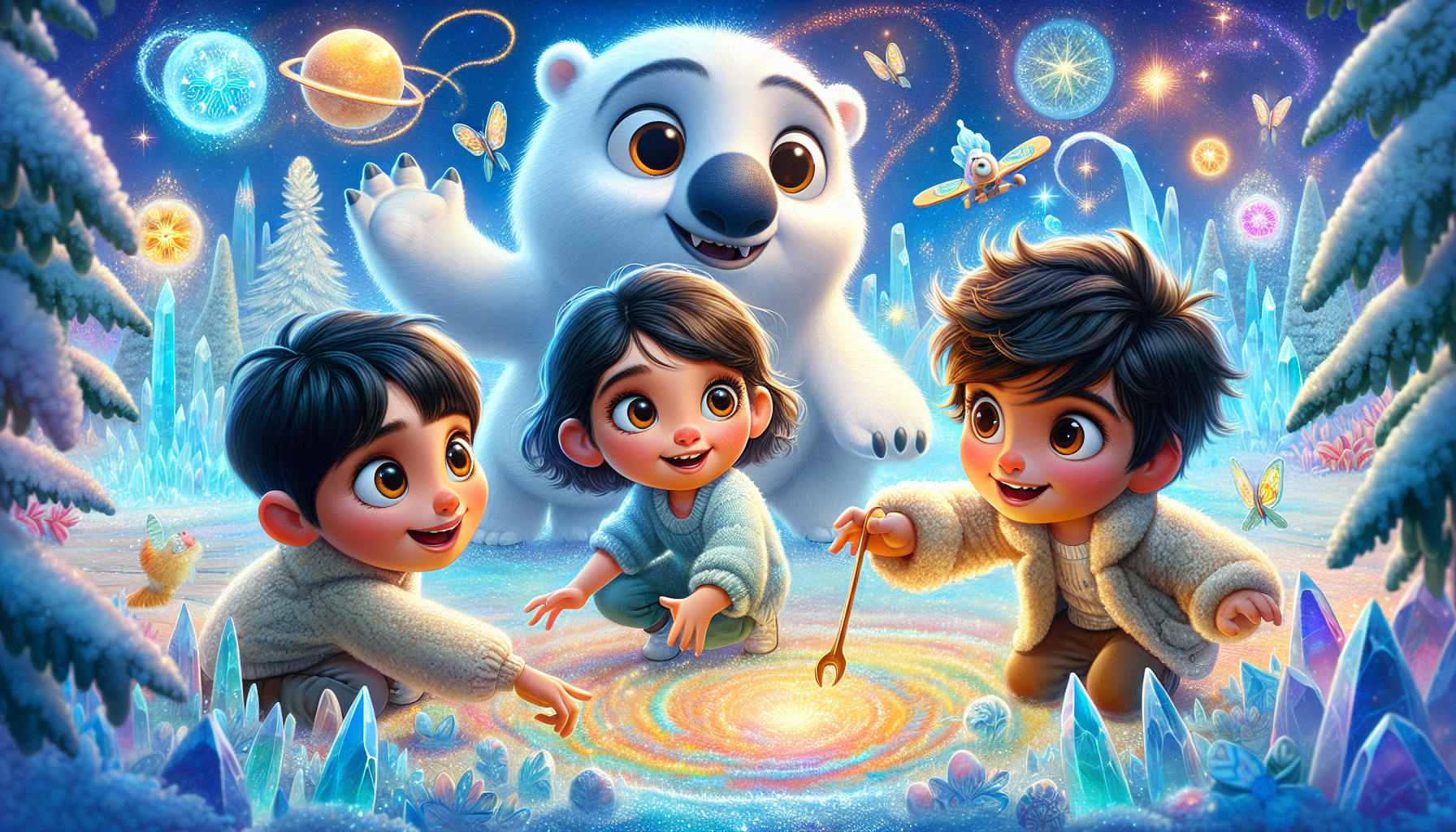 Pola, being the adventurous snow bear they were, knew something was up. "What could that be?" Pola wondered aloud, their voice as soft as a falling snowflake. They waddled to the highest ice peak to get a better look. The signal pulsed with a gentle glow, and suddenly, Pola saw it – a spaceship, stuck and sputtering! It looked like a spaceship, but it was shaped like a… dinosaur! “A space dinosaur!” Pola exclaimed, their eyes wide with excitement. Aarav would have loved this, Pola thought. The space dinosaur's spaceship was surrounded by a swirling, energetic field that hummed with power. It was a little loud, but Pola wasn't scared; they knew they had to help. Pola decided to use their amazing snowflake-making skills to fix the ship. "Alright, time for action!" Pola declared, their blue ears perked up. They started by creating a giant snowflake shaped like a wrench. It was a perfect fit for the ship's broken engine. But before they could reach the ship, they realized they had to get through the energetic field. It was like a giant, invisible puzzle. They needed a way to focus their energy and make the snowflake wrench work!