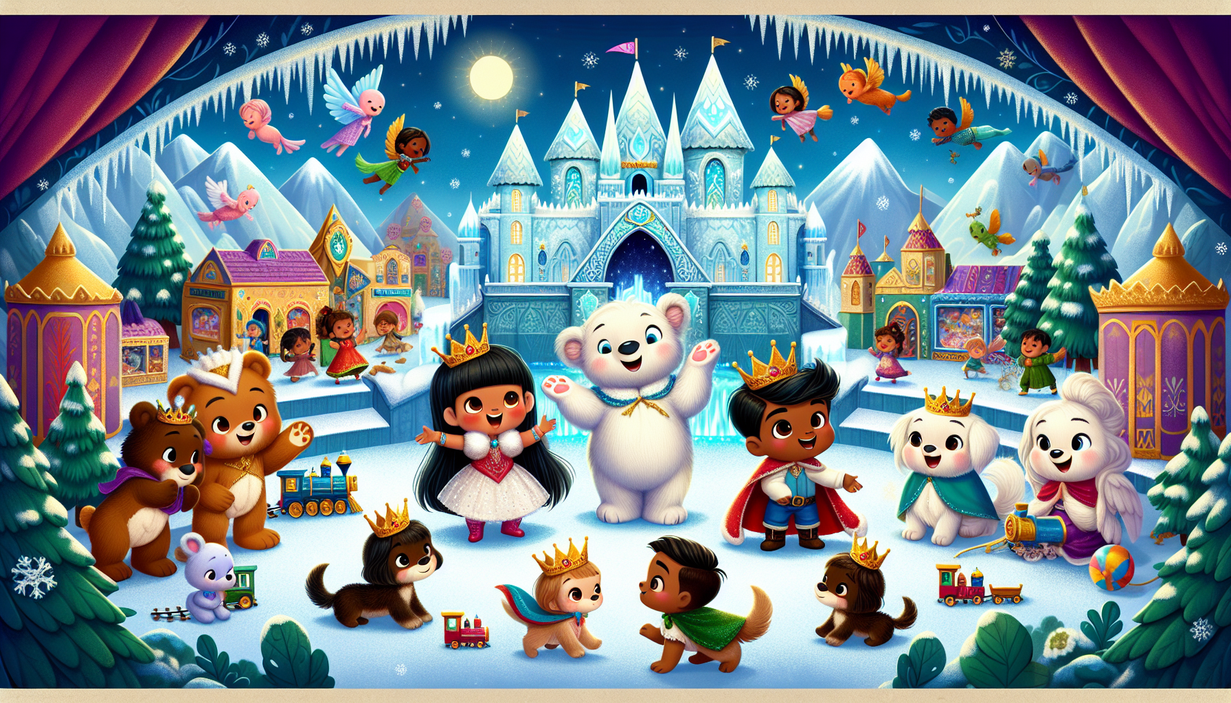 In a snowy village nestled between mountains, four little friends—Sitara, Jahaan, Azal, and Kaia—lived in cozy cottages. The village sparkled under a blanket of snow, and the air was crisp and filled with the scent of pine trees. The village was ruled by Bearon, the Royal Fluff, a noble bear who wore a shiny crown and was known for his kindness and love of tea parties.
